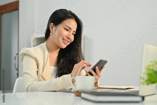 Attractive asian female financial advisor chatting with client online, giving internet consultation to customer via mobile phone