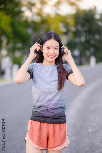 attractive asian woman healthy jogging exercise with headphones in park outdoor at evening