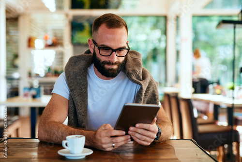 Attractive bearded man with glasses sitting in a cafe searching on tablet