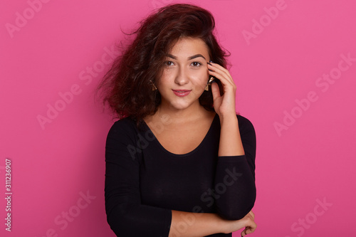 Attractive beautiful brunette woman with perfect skin posing isolated over pink background, wearing black shirt, looking directly at camera, keeping hand on her ear,having pensive facial expression.