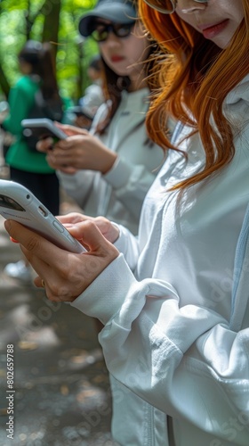 attractive beautiful European women using and texting on his smart phone mobile for service 5g digital communication and online social media city banner created by ai