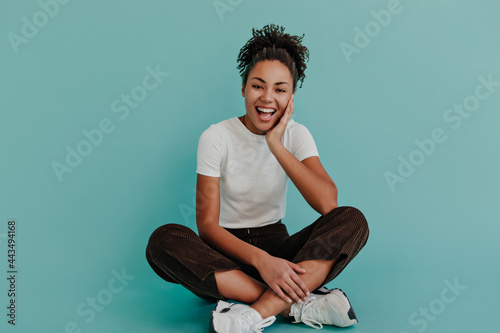 Attractive black woman propping face with hand and smiling. Front view of glad african american girl sitting with crossed legs on turquoise background.