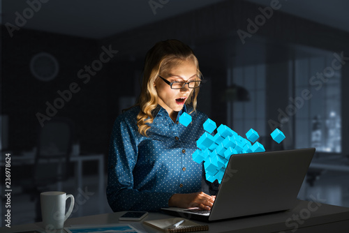 Attractive blonde wearing glasses in dark office using laptop. Mixed media