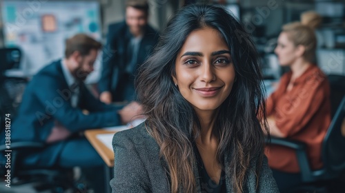 Attractive businesswoman posing at her work place with coworkers in the background.