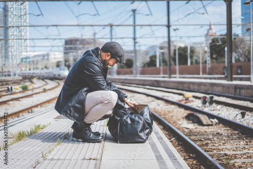 Attractive confident hispanic man having a backpack front of him with a clothes bag, walking beside a platform at train station