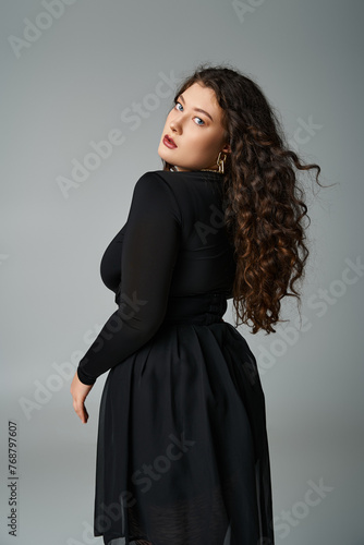 attractive curvy woman in black outfit looking to camera from behind back on grey background