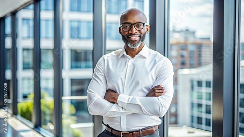 Attractive forty-five-year-old African American businessman stands confidently alone in modern office beside large window, wearing white shirt and glasses.
