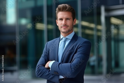 Attractive Happy wealthy rich successful business man standing in big city modern skyscrapers street thinking of successful future vision, dreaming of new investment opportunities.
