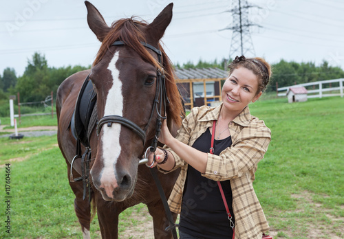 Attractive joyful horsewoman holding chestnut horse