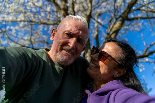 attractive middle-aged couple taking a funny selfie with their cell phones while doing gymnastics outdoors
