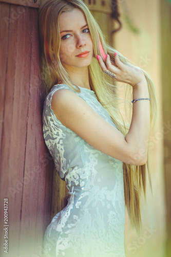 Attractive modest young blond woman playing with hair on red wooden background her hair painted in pink striped striped, in blue dress shy and inquisitive