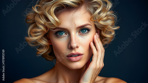 Attractive sensual confident mature woman smiling, enjoying life with natural beauty and short curly hair, healthy skin. Beautiful portrait, middle aged model, skincare cosmetics. Closeup face