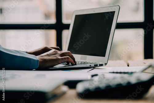 Attractive smiling young asian business woman work at home office, Asian woman working on laptop computer holding tablet.