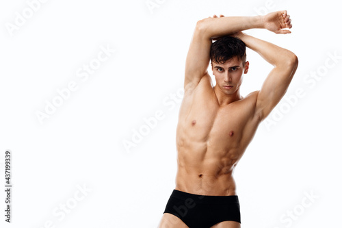 attractive sportsman with a pumped-up torso holds his arms above his head cropped view