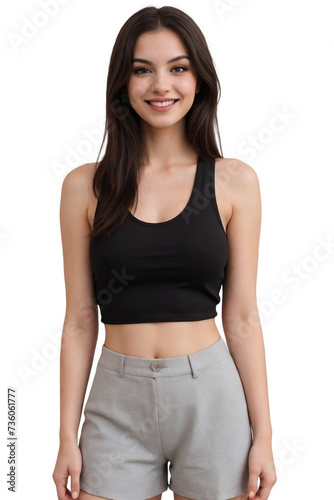 Attractive woman in a black cropped tank top smiling and looking at the camera, isolated, transparent background, no background. PNG.