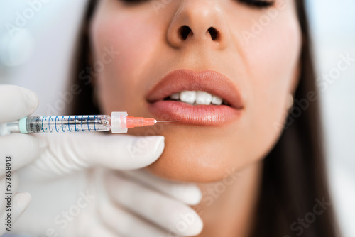 Attractive woman is getting a rejuvenating facial injections at beauty clinic. The expert beautician is filling female wrinkles with botulinum toxin injections or hyaluronic acid fillers.