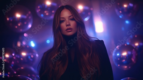 Attractive Woman Posing at Disco Party, Surrounded by Shiny Disco Balls, Nightlife and Entertainment