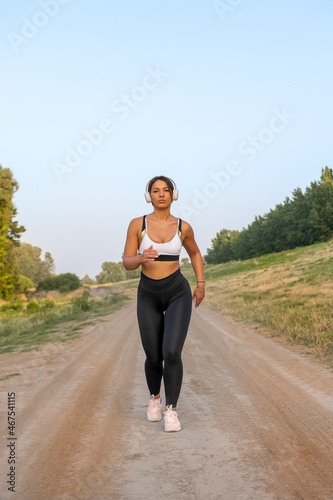 Attractive woman running in park. Motion photography. Outdoor activity.