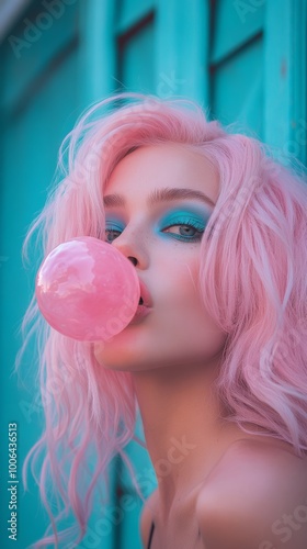 Attractive woman with pink hair blowing bubble gum bubble