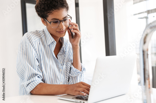 Attractive young african woman working on laptop computer
