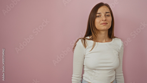 Attractive young caucasian woman with blonde hair and a beautiful smile posing over an isolated pink background wall