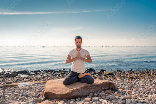 Attractive young man practicing yoga meditation and breathwork outdoors by the sea