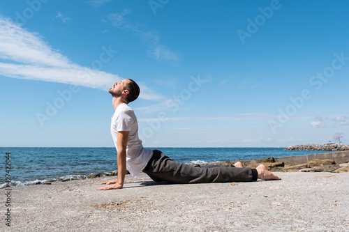 Attractive young man practicing yoga meditation and breathwork outdoors by the sea