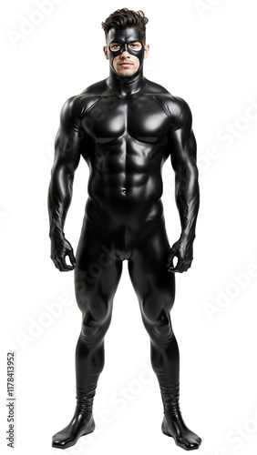 attractive young muscular man with athletic build in black latex cloth isolated at transparent background png