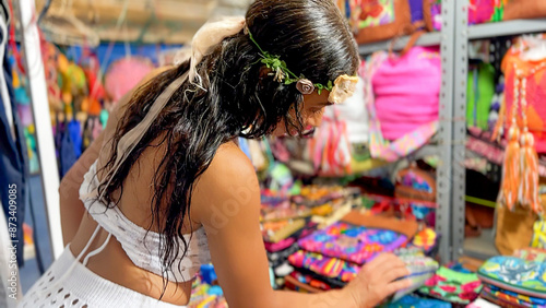 Attractive young sexy female tourist buying gifts and souvenirs of her vacation to take home a souvenir of her visit to the heart of the Riviera Maya.