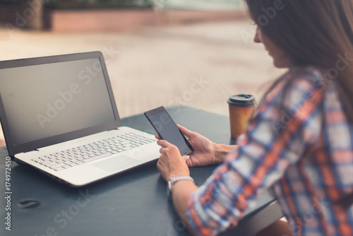 Attractive young woman reading a text message on her cell phone. Girl sitting outdoors using smartphone