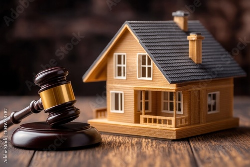 Auction for apartment sale with gavel and house model, showcasing a formal real estate transaction process