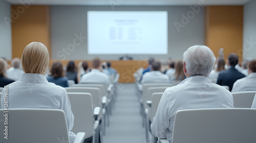Audience at a conference or seminar, attending presentation or lecture. Conference room, back view with white chairs and projector screen in the background.