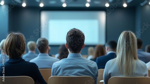 Audience from Rear in Seminar Meeting Room - Large Screen Displaying Video Presentation, Business Education and Corporate Training for Workers and Employees Photo