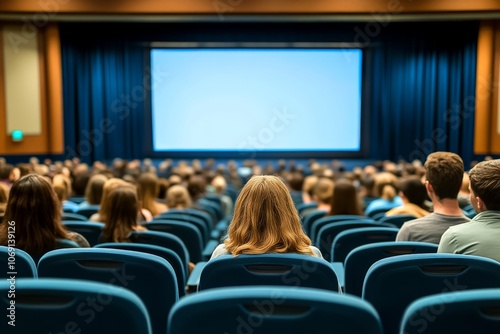 Audience in theater viewing screen symbolizing digital collaboration multimedia learning and tech enabled presentations in a modern education environment
