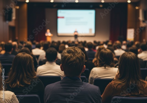 Audience members attentively listen to a presentation in a large conference hall.
