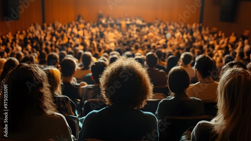 Audience Members Attentively Listen to a Presentation in a Large Hall