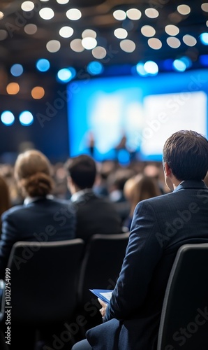 Audience watching presentation at business conference with blurred background lights