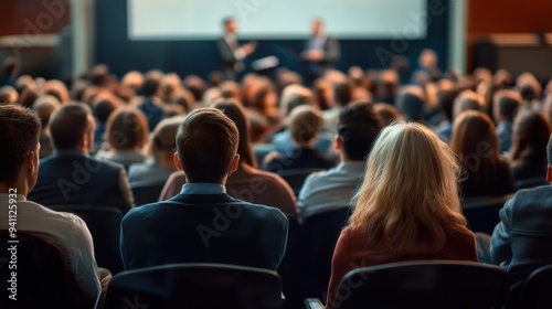 Audience watching speaker in auditorium, business presentation with copy space