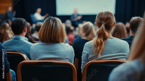 Audience watching speaker in auditorium, business presentation with copy space