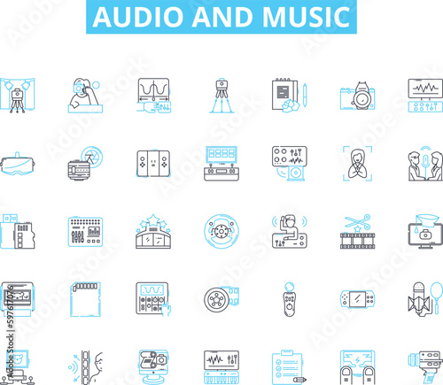 Audio and music linear icons set. Melody, Rhythm, Harmony, Tempo, Beat, Groove, Vibe line vector and concept signs. Sound,Instrument,Voice outline illustrations Generative AI