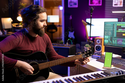 Audio engineer performing on guitar in his home studio, watching video tutorials and practicing on strings. Musician learning multiple songs on acoustic instrument, uses smartphone greenscreen.