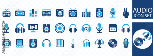 Audio icon set. Containing headphones, sound, music, volume, earphones, equalizer and speaker icons. Solid icon collection. Vector illustration