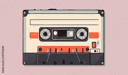 Audio tape cassette. Vector illustration of isolated vintage old fashion tape. Isolated sound recorder. Old media for music. Analogue technology. Disco, pop player. Musical icon. 80s object. Music mix