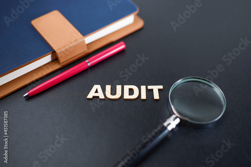 AUDIT, magnifying glass, pen, and notebook on the dark background
