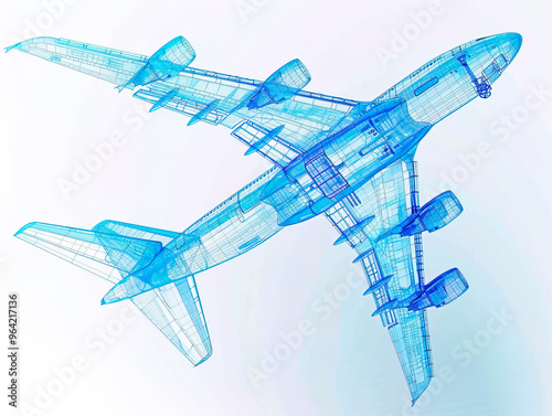 Augmented Reality Airplane Jet Engine Simulation. Advanced Industry Research and Development. Airplane visualization with augmented reality Transparent airplane in studio drawing in blue colors