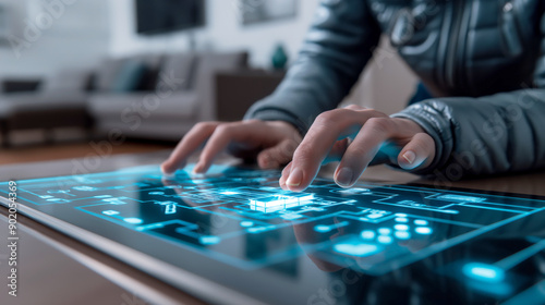 Augmented reality architecture creation process AR house model. Edit and manipulate holographic scheme by touch and gestures. AI generation