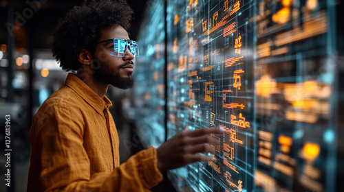 Augmented reality user interacting with floating 3D models and digital annotations
