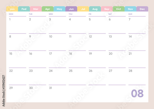 August 2022 simple design digital and printable calendar template illustration. Notes, scheduler, diary, calendar, memo, planner document template background.