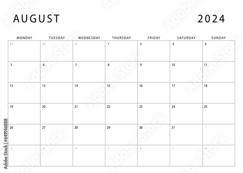 August 2024 calendar. Monday start. Monthly planner template. Vector design