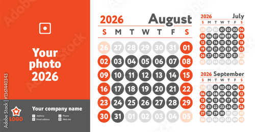 August 2026 calendar. New year wall planner design. English calender. Red color vector template. Week starts on Sunday. Business planning.